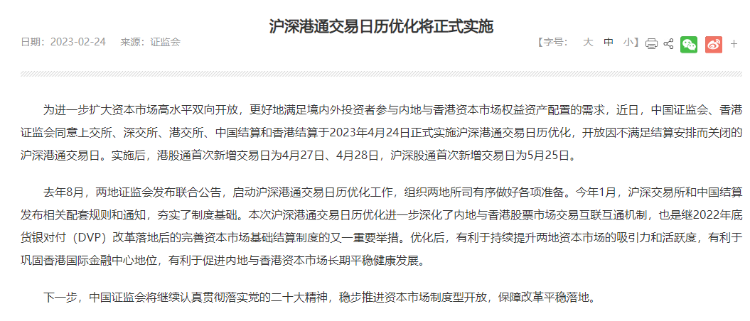 据证监会消息,为进一步扩大资本市场高水平双向开放,更好地满足境内外投资者参与内地与香港资本市场权益资产配置的需求,近日,中国证监会、香港证监会同意上交所、深交所、港交所、中国结算和香港结算于2023年4月24日正式实施沪深港通交易日历优化,开放因不满足结算安排而关闭的沪深港通交易日。实施后,港股通首次新增交易日为4月27日、4月28日,沪深股通首次新增交易日为5月25日。
