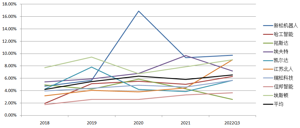 估值之家对比上市公司毛利率发现,近几年上市公司毛利率普遍处于下滑状态,其中新松机器人毛利率又处于行业垫底的水平。新松机器人2021年、2022年毛利率均降至了10%以下,远远低于其他上市公司15%-30%水平。