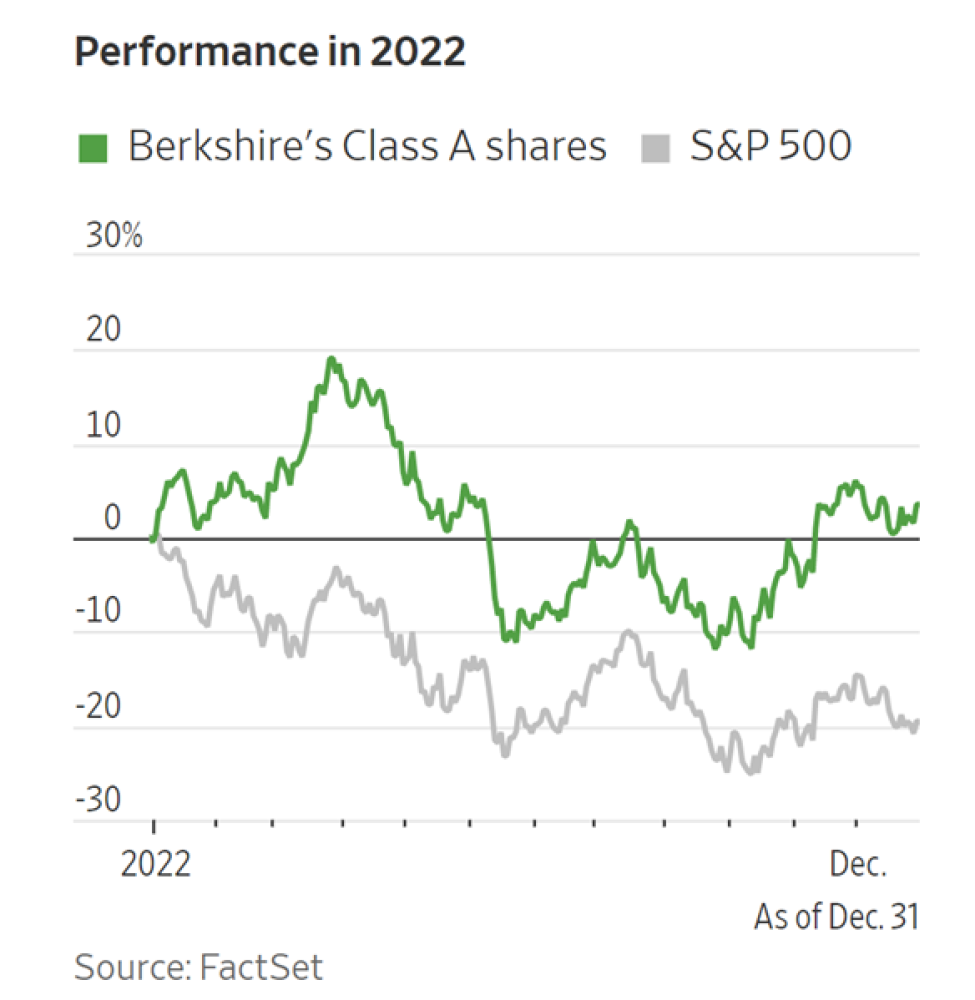 2022年全年,伯克希尔哈萨维的投资业务出现高达536亿美元的浮亏,如果计入税收减免,投资亏损更是高达631亿美元。美股市场在2022年整体下行,标普500指数全年累计下跌近20%。巴菲特由于持股集中在美国大型上市公司,与整个美股市场趋势的相关性极强,因此投资业绩也遭遇大幅较大冲击。但伯克希尔哈萨维公司本身的股价依然跑赢了大盘,尽管震荡加剧,但全年依然实现了近4%的上涨。