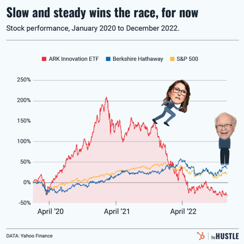 以上是在去年被许多人所津津乐道的一张对比图,巴菲特的伯克希尔哈萨维股价尽管没有在2020年4月至2021年4月取得惊人的投资业绩,但一致保持稳定上行的趋势,与此相对比,方舟基金创始人、人称“木头姐”的凯西 伍德掌管的以科技成长股为主的ARK创新ETF基金,却出现了大起大落的走势,尽管从2020年4月至2021年4月这一年间获得了超过200%的惊人涨幅,但随后也遭遇了大幅回撤,两年来的投资业绩反而逊于伯克希尔哈萨维的股价涨幅。