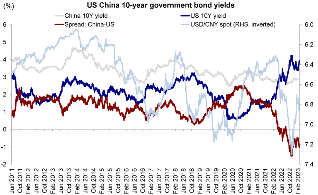 芝加哥商品交易所的联储观察工具显示,投资者正在重新评估对美联储政策收紧步伐的预期,市场预计在未来的三次FOMC会议上,美联储将会持续加息25个基点,并最终将基准利率上调至5.25%-5.5%的区间。与此同时,FOMC 2月会议纪要仍然表明美联储官员决心将通胀率降至2%的目标且未来仍需要一段时间才能实现这一目标。最后,我们也建议投资者密切关注近期中美关系不确定性(例如更多限制性新规)和欧洲地缘政治冲突最新进展。
