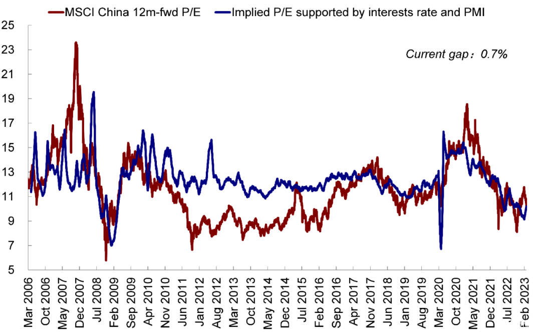 图表:MSCI中国指数估值较我们所测算的当前经济增长状况所支撑的合理水平相比仅高出约0.7%