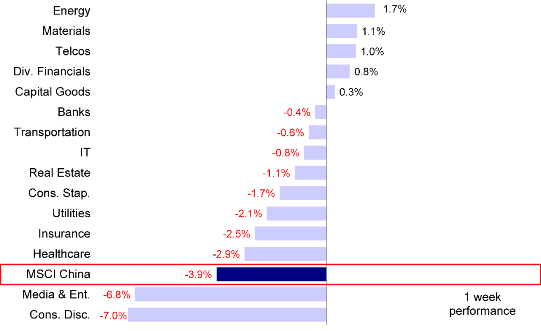 图表:MSCI中国指数上周下跌3.9%,可选消费板块跌幅最大