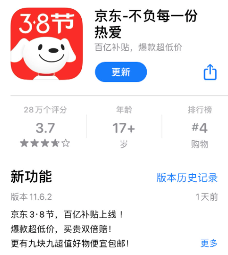 京东APP宣布升级11.6.2,更新日志中明确提到:“京东3.8节,百亿补贴上线”。据悉,此次百亿补贴将覆盖全品类,并不只局限于3C等京东传统优势品类,且自营和POP商家都将参与其中。而且与与此前只在6·18或者双11等大促期间,入口隐藏较深不同,这次“百亿补贴”将在京东App内拥有一级入口。