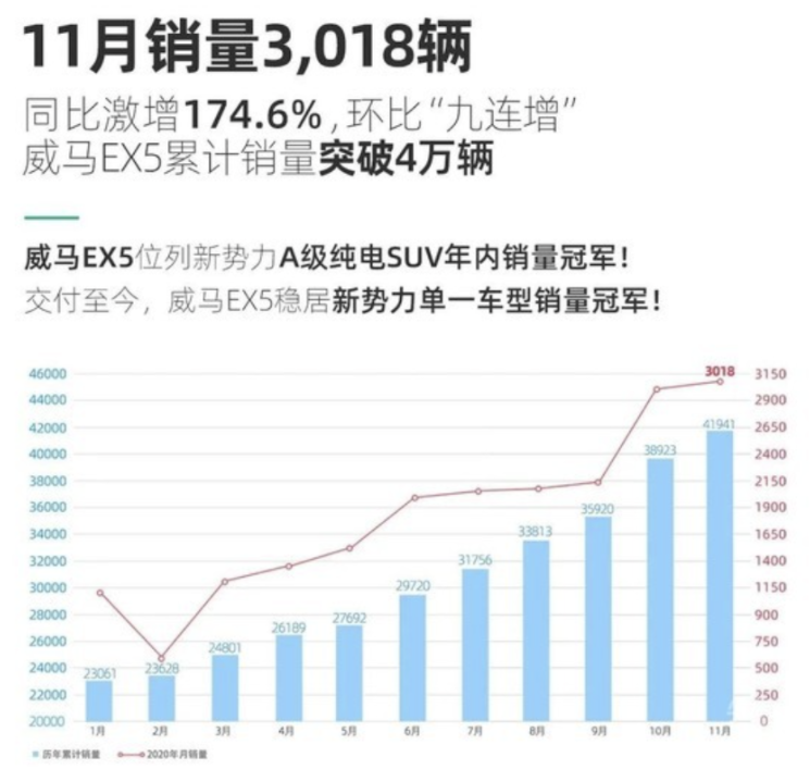 2018年9月,威马汽车实现首款车型EX5的量产交付,是一众造车新势力中,较早实现量产的企业。2019年,威马汽车的年度销量仅次于蔚来,在造车新势力中排名第二。