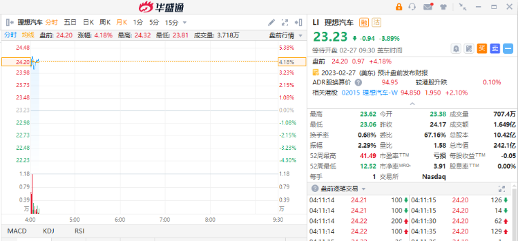 理想汽车盘前涨超4%,报24.2美元。理想汽车2022年第四季度营收176.5亿元,市场预期176.22亿元,上年同期106.2亿元。预计2023年第一季度,车辆交付量为52000至55000辆,较2022年第一季度增长64.0%至73.4%。截至发稿,小鹏汽车盘前涨近5%,蔚来盘前涨超2%。