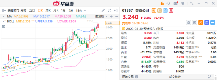 美图公司再度飙升近10%,现报3.24港元/股。据资料显示,该股在2月27日获南下资金净买入244.2万,2月23日至27日累计获净买入1.15亿港元。
