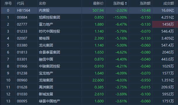 港股内房股午后跌幅扩大,旭辉控股集团跌15%,富力地产跌超6%,时代中国控股、碧桂园跌超5%,龙湖集团、宝龙地产、新城发展、绿景中国地产均跌超3%。