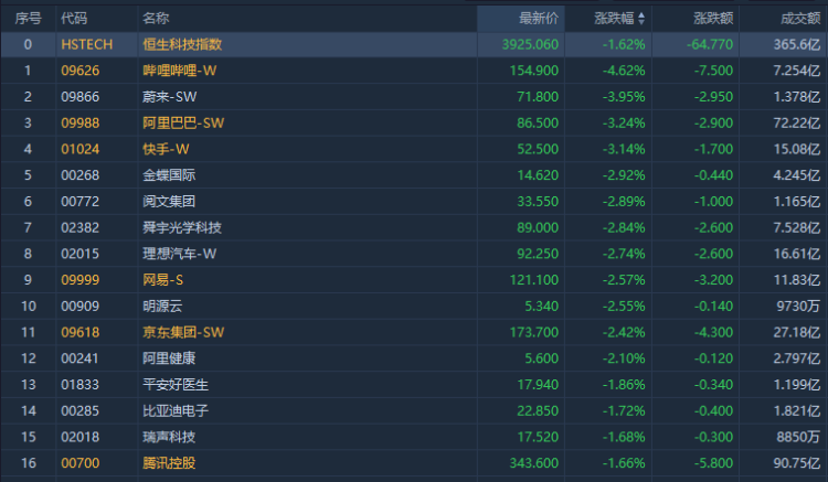 恒生科技指数大跌1.62%,哔哩哔哩跌4.6%,蔚来跌4%,阿里巴巴、快手跌超3%,理想、阅文等跌近3%。