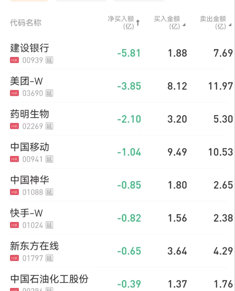 南下资金今日净买入港股-7.8亿港元。腾讯控股、中国石油股份、中国海洋石油分别获净买入3.25亿港元、3.05亿港元、2.23亿港元;建设银行净卖出额居首,金额为5.81亿港元。