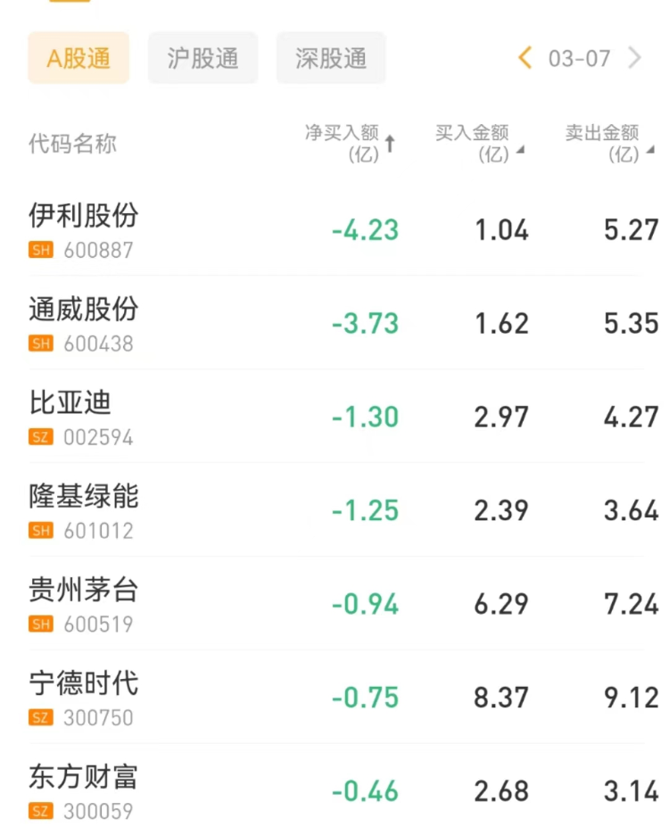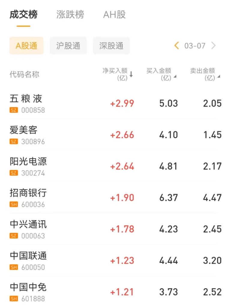 北向资金今日净买入-1.88亿元。五粮液,爱美客,阳光电源分别获净买入2.99亿元、2.66亿元、2.64亿元。伊利股份净卖出额居首,金额为4.23亿元。