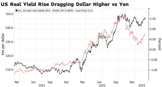 包括Kamakshya Trivedi在内的策略师在上周五的一份报告中写道,如果市场继续消化美国经济增长的弹性和比预期更多的加息,那么“日元战术上表现不佳”的空间将进一步扩大。他们表示,当经通胀调整的美国国债收益率上升时,日元通常会走弱。