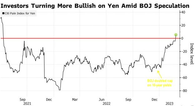 因此,花旗日元痛苦指标(衡量交易员整体头寸的指标)自2021年以来首次攀升至零以上,这是积极情绪升温的迹象。投资者继续押注日本央行行长4月换届将推动更多政策调整,预计这将提振日元。