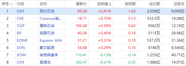 美股油气股涨跌不一,西方石油涨超2%,康菲石油、英国石油、EQNR微涨,埃克森美孚微跌,雪佛龙跌0.21%,公司此前宣布提高股票回购计划指引。