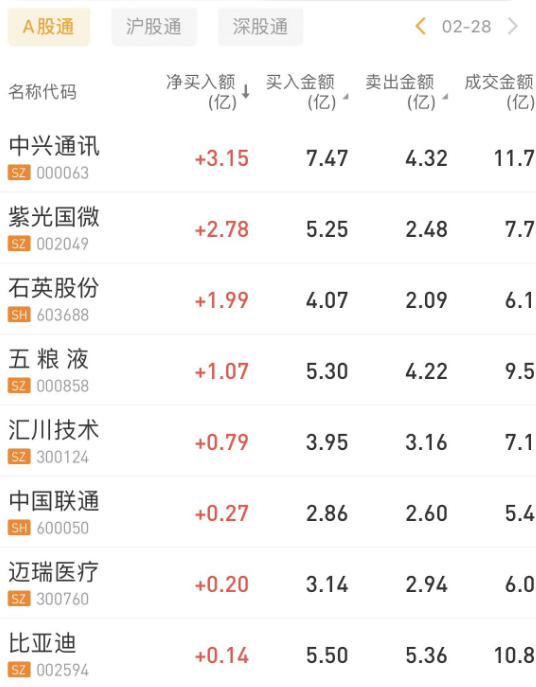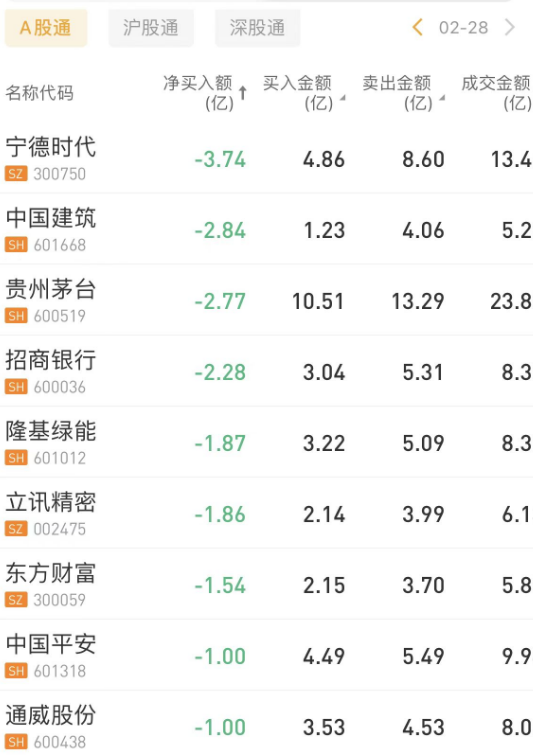 北上资金今日净卖出13.04亿元。宁德时代、中国建筑、贵州茅台分别获净卖出3.74亿元、2.84亿元、2.77亿元。中兴通讯净买入额居首,金额为3.15亿元。