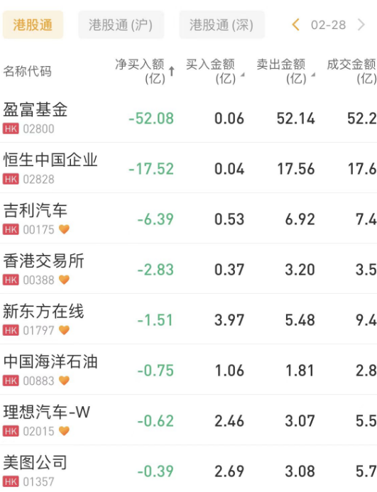 南向资金今日净卖出32.15亿港元,港股通(沪)净卖出24.97亿港元,港股通(深)净卖出7.18亿港元。上一交易日净买入60.49亿港元。