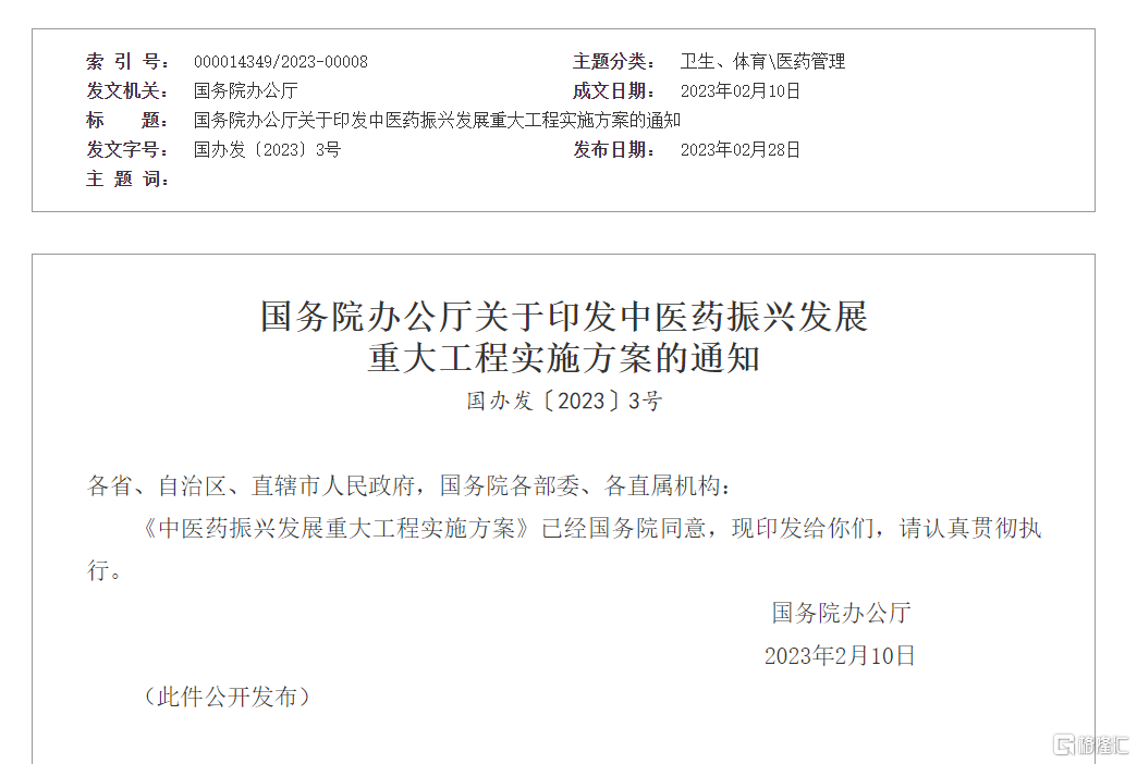 东吴证券表示,2月份即将结束,一季度渐进明朗,医药配置方向进入一季报窗口期,其中中药、药店等子行业业绩确定性更高;医疗服务在2023年确定性更高,随着疫情结束门诊量全面恢复、业绩将进入快速增长期。两因素利于优质中药上市公司进入重点配置窗口期,其一:国家药监局发布《中药注册管理专门规定》,其为落实《中共中央、国务院关于促进中医药创新传承发展的意见》,并与新修改的《药品管理法》、《药品注册管理办法》有机衔接,强调人用经验作用与临床价值,利于中药创新研发;其二进入布局一季度报告窗口期,优质中药标的很可能大超预期。
