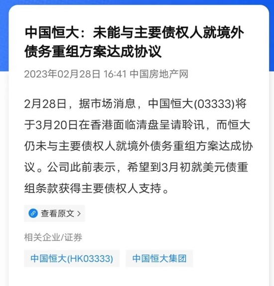 2月28日,据报道,有知情人士表示,中国恒大尚未与主要债权人,就境外债务重组方案达成协议,而该方案对避免被法院可能下发清盘令至关重要。