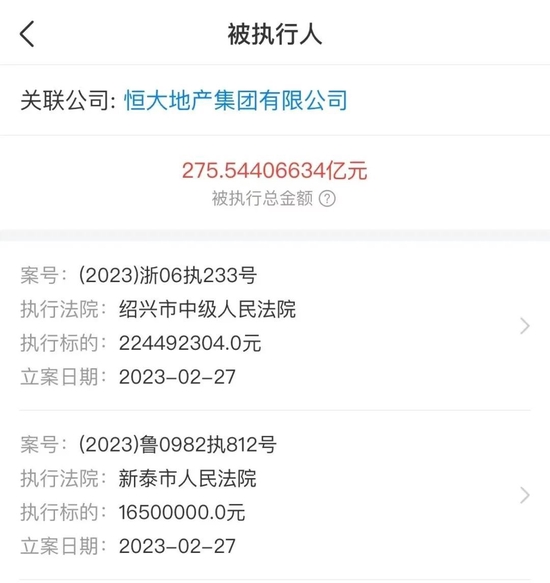 就在昨天,2月27日,天眼查显示,恒大地产集团有限公司再新增6则被执行人信息,执行标的合计11亿余元,被执行人还包括多个恒大地产集团旗下公司。目前,恒大地产被执行总金额已超275亿元。
