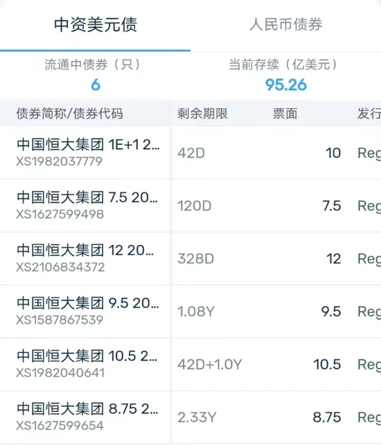 DM查债通显示,发债主体中国恒大集团,目前流通中的中资美元债共6只,规模95.26亿美元,按最新汇率,折合人民币约660亿元。其中,最近一笔将在今年4月11日到期,票面利息高达10%,该债券余额8.5亿美元。