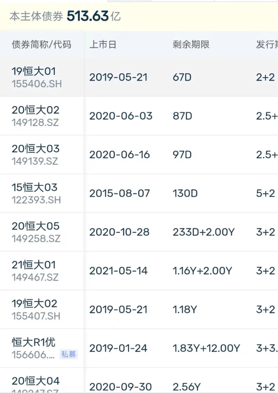 DM查债通显示,发债主体恒大地产集团,目前存续的人民币债券规模达513.63亿元。其中,最近一笔将在今年5月6日到期,票面利息6.27%,债券余额150亿元。