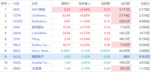 华盛资讯2月28日消息,美股热门WSB概念股多数走高,AMC院线涨超9%报8.33美元每股,成交额3.17亿美元,公司将于盘后发布财报;Coinbase $COIN 涨6.82%报62.98美元每股;Robinhood $HOOD 涨1.54%,游戏驿站、Roblox $RBLX 跟涨,3B家居由涨转跌2.7%。