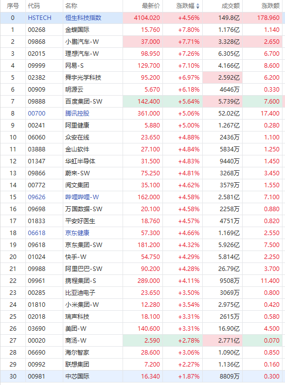科网股走强,网易-S涨超7%,腾讯控股涨超5%,百度集团-SW涨超5%,阿里巴巴-SW,京东集团-SW,快手-W涨超4%,小米集团-W涨超3%。
