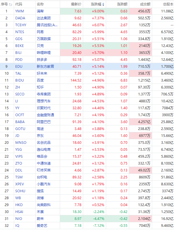 截至发稿,满帮涨9%报7.63美元每股,腾讯控股ADR $TCEHY 涨超6%;科网股多数走强,哔哩哔哩涨5.7%,拼多多涨超5%,百度涨4.96%,阿里巴巴涨超4%,京东、高途涨超3%。