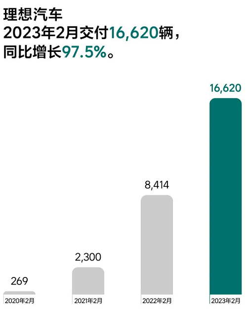 具体来看,理想汽车公告,2月交付量为16,620辆,同比增长97.5%。自交付以来,理想汽车累计交付量已达到289,095辆。