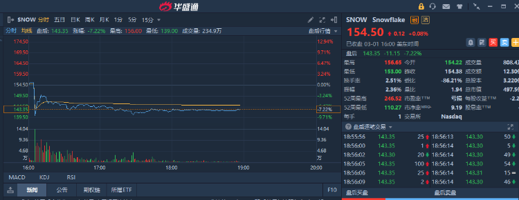 Snowflake(SNOW.US)股价于周三美股盘后走低,跌超7%,截至发稿报每股143.46美元,主要由于该公司公布了好于预期的第四季度业绩,但第一季度指引展望较为疲软。