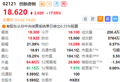 创新奇智(02121)早盘大涨近18%,高见19.30港元,现报18.62港元,成交额3764万港元。