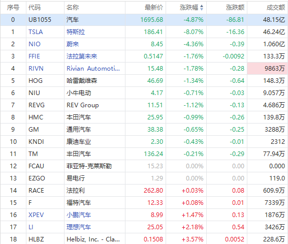 华盛资讯3月2日消息,美股汽车股多数走跌,特斯拉跌8.07%报186.41美元,2023投资者日未提及市场预期的下一代电动汽车的确切细节;蔚来跌4.36%,Rivian、法拉第未来跌超1%,本田汽车、丰田汽车跟跌;小鹏汽车、理想汽车微涨。