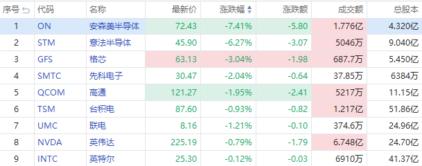 半导体板块普跌,3倍做空半导体指数股票-Direxion $SOXS 涨超5%,安森美半导体 $ON 跌超7%,意法半导体 $STM 跌超6%,格芯跌超3%,高通、台积电、英伟达跟跌。