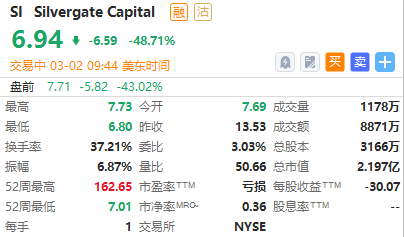 个股方面,加密货币交易银行Silvergate $SI 暴跌48%,此前宣布推迟其2022年度报告,正在评估其作为持续经营企业的能力。Silvergate报告第四季度亏损10亿美元,因为投资者在加密交易所FTX破产后竞相提取存款,该公司的麻烦凸显了对数字资产信心的脆弱性。