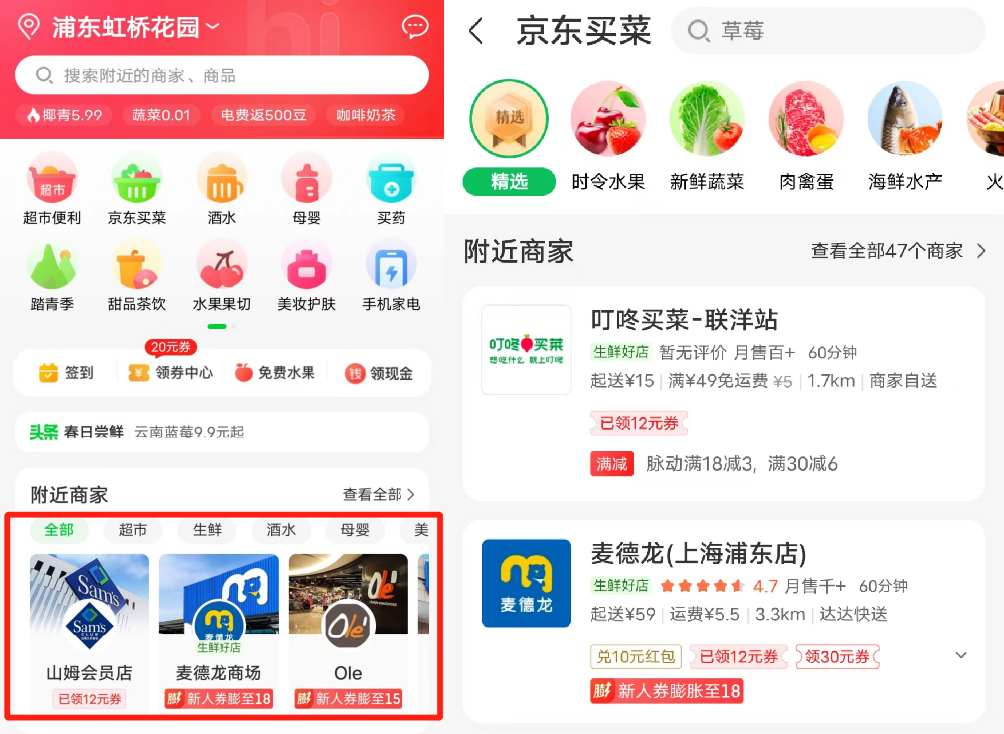 同时,当定位更改至“上海浦东虹桥花园”时,可以发现京东买菜还接入了山姆会员店、OLE精品超市等连锁商超、叮咚买菜等前置仓电商,以及菜市场业态。