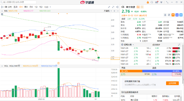 3月2日讯,瑞士信贷跌超8%,最低触及2.75美元,创下历史新低。
