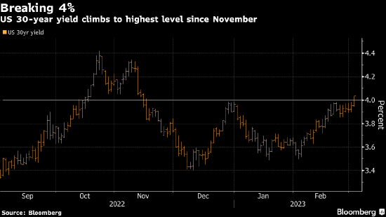 在第四季度单位劳动力成本升幅向上修正之后,整个美国国债市场的收益率至少上涨了5个基点。30年期国债收益率一度上涨8个基点至4.03%,远高于2月初触及的2023年低点3.5%。