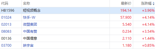 短视频概念股集体上升,快手-W(01024)涨4.50%,微盟集团(02013)涨4.14%,中国有赞(08083)涨3.54%,移卡(09923)涨2.07%,中国儒意(00136)涨1.11%。