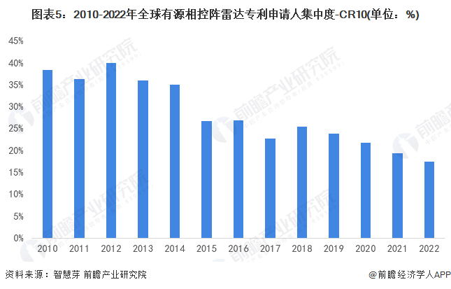 2010-2022年,全球有源相控阵雷达专利申请人CR10呈现波动下滑趋势,由2010年的38.46%降至2022年的17.43%。