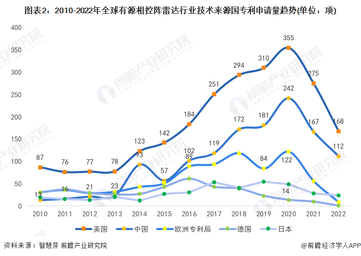 从趋势上看,2010-2022年,美国有源相控阵雷达专利申请数量一直领先于全球其他国家。2022年,全球有源相控阵雷达申请数量呈下滑趋势,其中,中国有源相控阵雷达专利申请量为112项,美国有源相控阵雷达专利申请量为168项,两国差距进一步缩小。