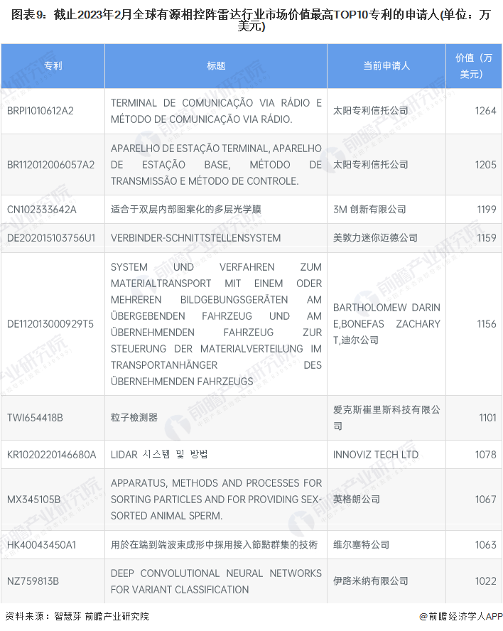 全球有源相控阵雷达市场价值最高TOP10专利中,排名第一的归属太阳专利信托公司,价值1264万美元。