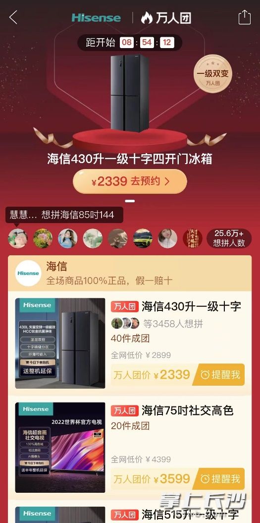 3月3日,海信品牌专场将正式登陆拼多多38大促主会场。此外,海信旗下冰箱、电视、空调、洗衣机等近30款产品也将在万人团频道同时开团。据拼多多APP页面显示,在距离开团还有9小时的预热阶段,海信万人团专场已经吸引了25.6万人参与。