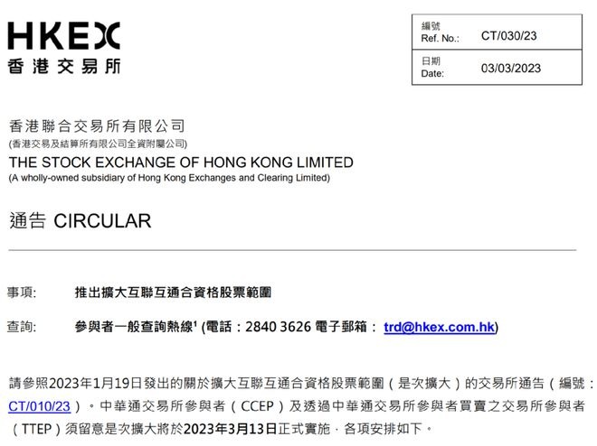 香港交易所:沪深港通股票标的范围3月13日起再扩容