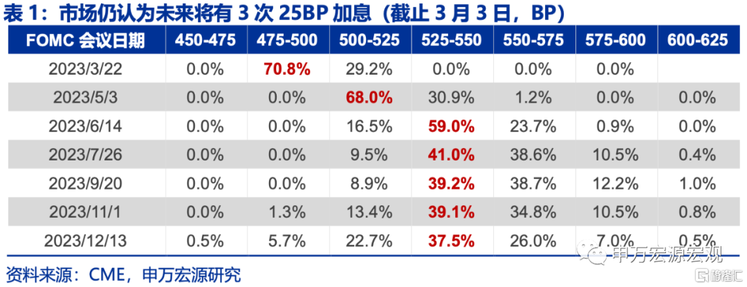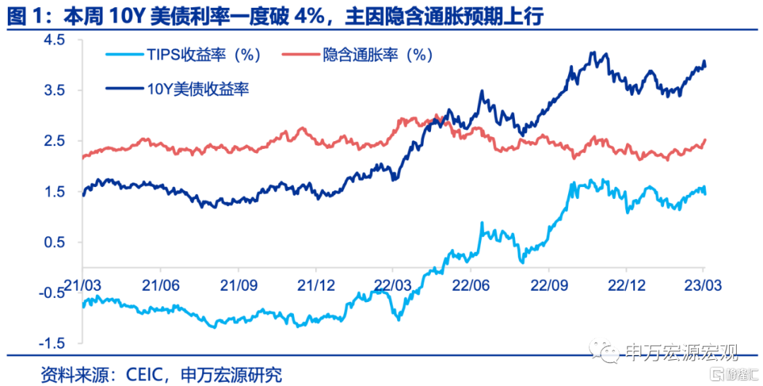 近一月来10Y美债利率上行主要为美联储加息预期上修所推动,但上周利率破4%主要为隐含通胀预期上行所致。随着今年2月陆续公布的美国经济数据超预期,指向美国居民消费强韧,通胀下行可能慢于前期预期,10Y美债利率自1月末以来上行达45BP至4.08%(截止3月3日),突破4%,其中主要为隐含通胀预期贡献(28BP),而实际利率亦贡献17BP,凸显市场对美国通胀未来走势向上修正,同时市场对美联储加息预期也大幅上调。而本周10Y美债利率的上行结构中(2BP),主要贡献仍来自于隐含通胀预期(14BP),实际利率却小幅回落12BP,显示市场对于美国通胀担忧持续提升,但市场对于美联储未来紧缩预期有所反复。