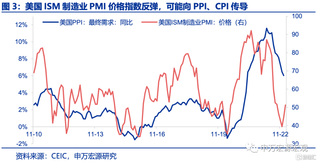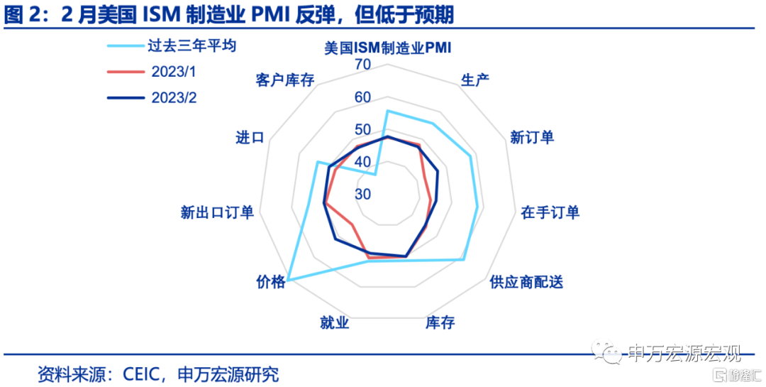 2月美国ISM制造业PMI呼应隐含通胀预期上行,显示美国需求缺口或有所放大,未来美国通胀下行可能受阻。3月1日公布的2月美国ISM制造业PMI环比反弹0.3至47.7,但幅度低于市场预期。且从结构上来看,新订单指数从42.5回升至47.0,未完成订单指数从43.4上行至45.1,或反映超额储蓄作用下美国居民需求仍然旺盛,但产出指数、就业指数却分别下滑0.7和1.5,或反映制造业生产有所弱化,则美国需求缺口收窄可能出现反复。特别是价格指数大幅反弹6.8至51.3,重回扩张区间,可能增添了市场对于后续美国通胀降温出现波折的担忧。
