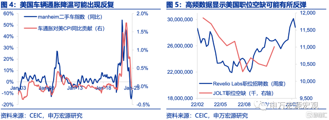 1)从隐含通胀预期来看,虽然年内美国房租通胀将出现拐点,但我们认为有两大因素可能使得美国通胀降温慢于市场预期。其一,疫情之后领先美国车辆通胀约2个月的Manheim二手车指数已连续3月环比反弹,美国耐用品通胀可能出现上行压力。其二,在超额储蓄犹存,美国居民消费火热传导下,美国劳动力市场降温速度可能较慢,可能导致核心非居住/房租通胀回落慢于预期。