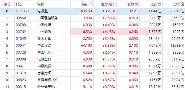 华盛资讯3月6日消息,港股电讯股集体走高,截至发稿,中国通讯服务涨7.58%领涨,中国铁塔涨4.49%报0.93港元每股,中国联通涨4.15%报6.53港元每股,续刷股价新高,中国移动涨超3%,成交额7.042亿港元;中国电信涨1.77%,电讯盈科、香港宽频跟涨。