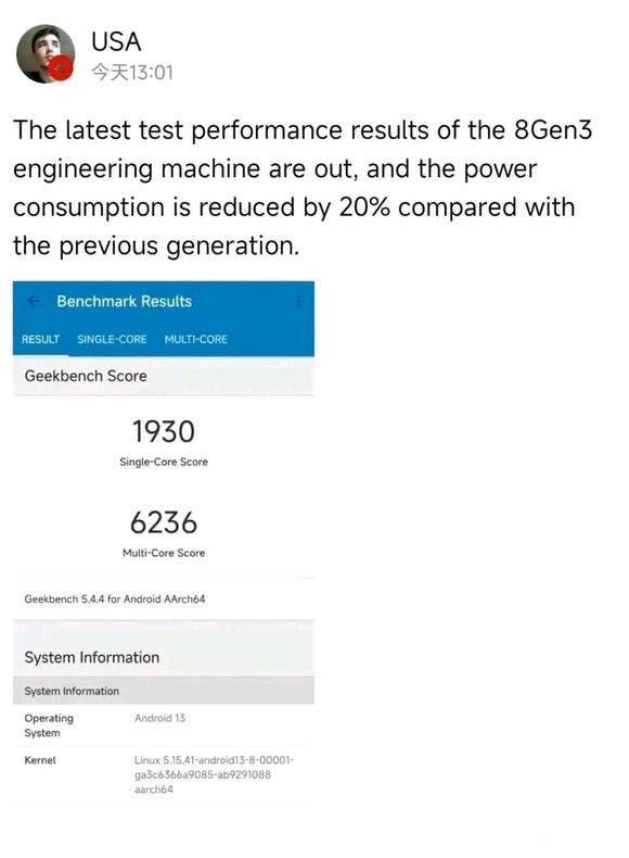 高通 Snapdragon 8 Gen 3 在 Geekbench 中超越了苹果 A16 Bionic。Geekbench 是一款流行的移动设备基准测试工具,最近泄露了 Snapdragon 8 Gen 3 的潜在得分。据称单核得分高达 1,930,而多核得分更高,达到了 6,236。这些数字远高于最初预期,之前的传言称单核得分为 1,800,多核得分为 6,500。将这些得分与当前的 Snapdragon 8 Gen 2 进行比较,后者平均单核得分为 1,491,多核得分为 5,164,显示出单核性能增加了 30%,多核性能增加了 20%。