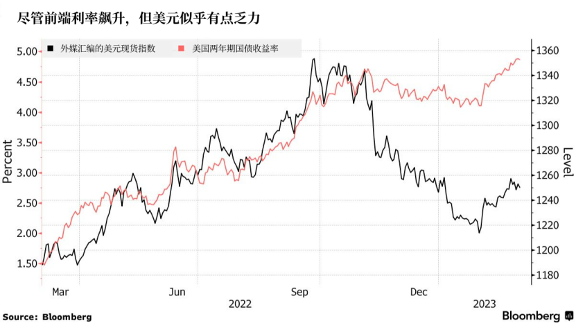 美国2年期国债收益率上周触及15年来最高水平,因劳动力成本高企,此前美联储青睐的PCE通胀数据强于预期,这加剧了市场对美联储进一步加息的预期。相比之下,美元的反应则相形见绌,因为它在接近去年9月底的高点时几乎没有进展。