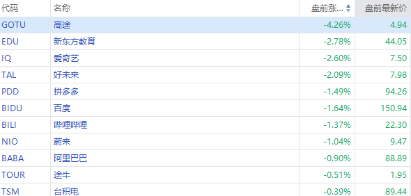 热门中概股美股盘前多数走弱,新东方教育跌近3%,拼多多、唯品会、百度、哔哩哔哩跌超1%;寺库集团盘前暴涨35%,中信认为电商出海将是国内电商平台重要的第二增长曲线。